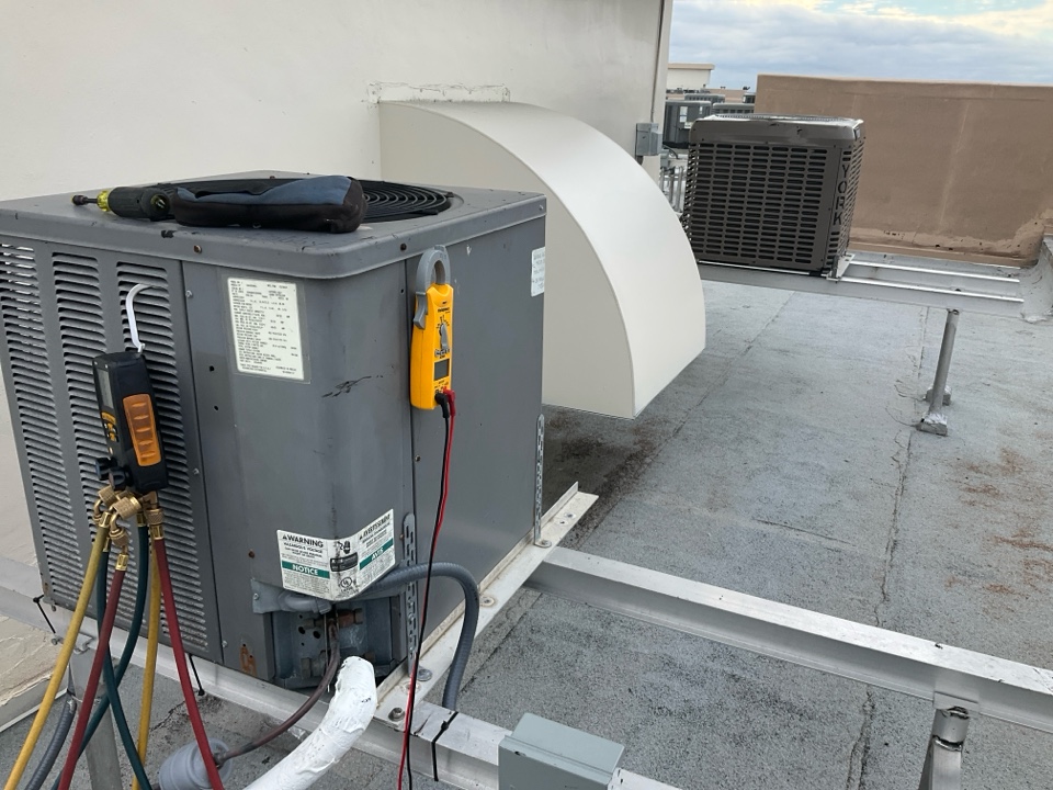 AC Maintenance Call. Perform routine maintenance per maintenance agreement on Rheem air conditioning split system.