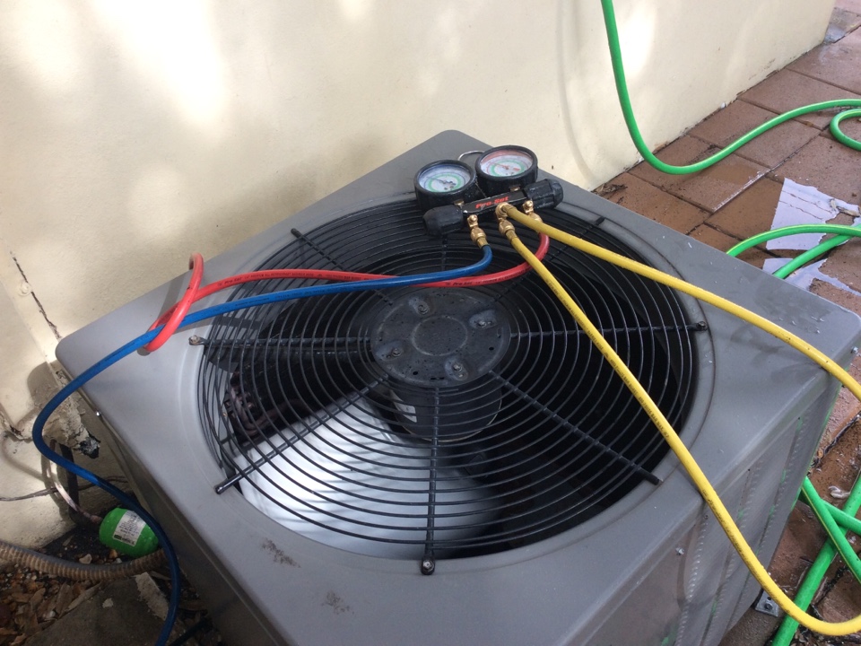 Wilton Manors, FL - AC Service Call. Evacuate all refrigerant and clean refrigerant lines. Charge system with new refrigerant.