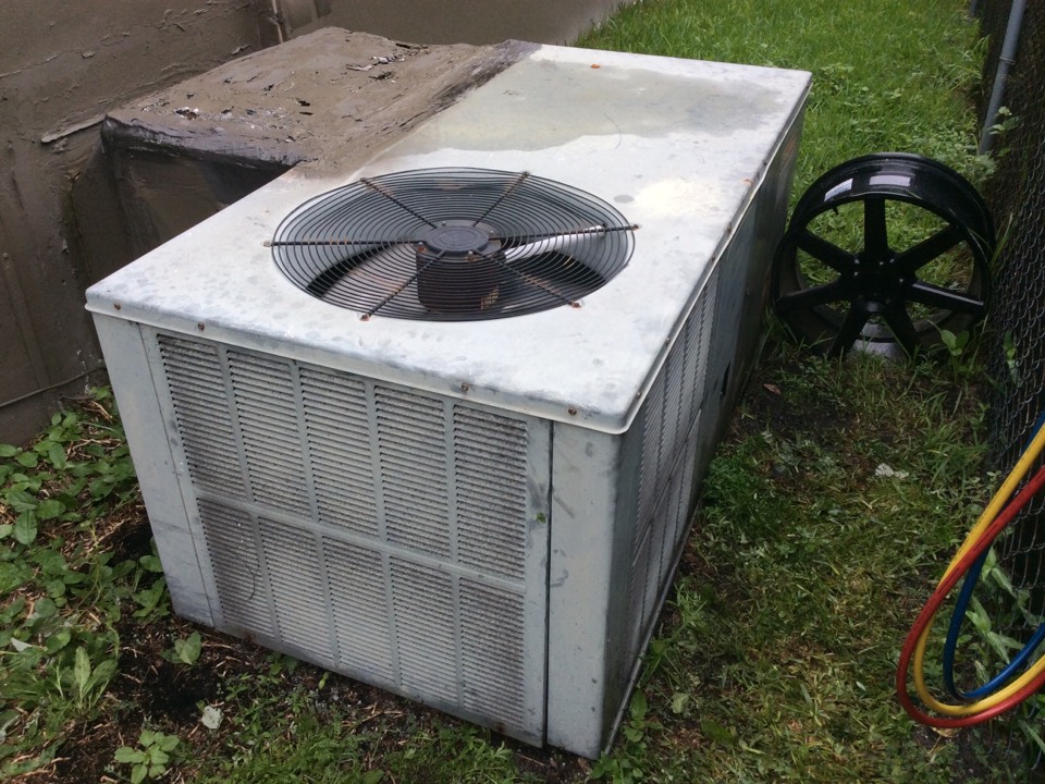 AC Service Call. Replace drain pan and condenser fan motor grill.